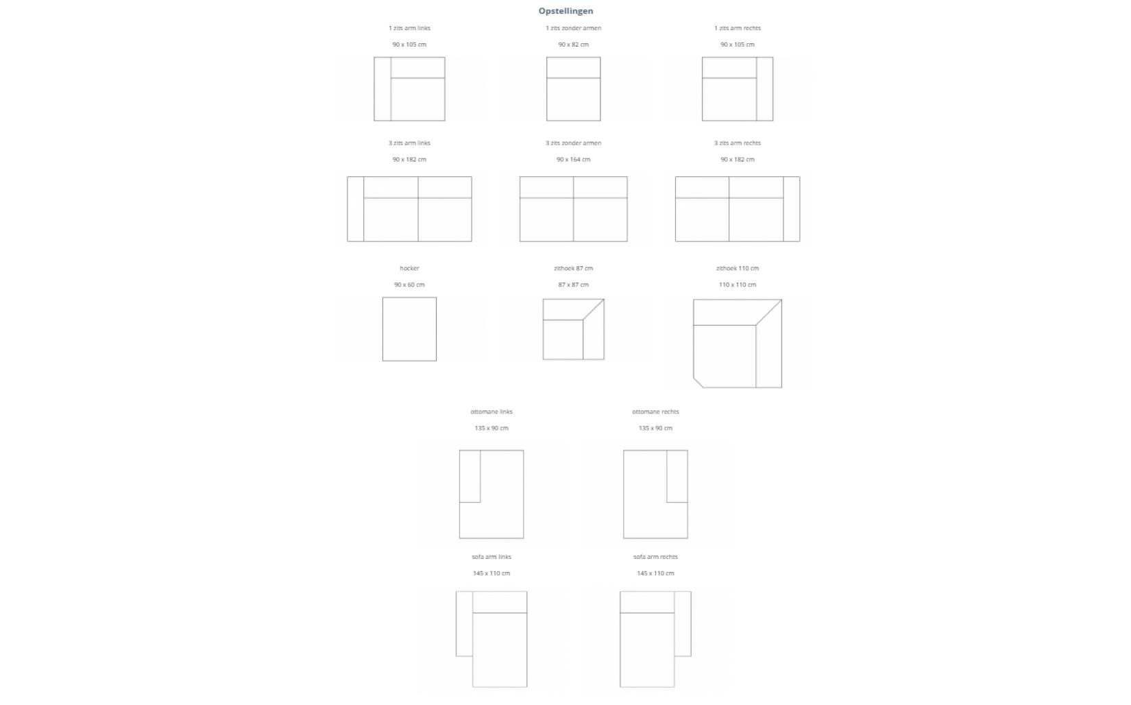 | Opmerking | Ottomane links, zithoek 110, 1-zits zonder armen, Sofa arm rechts. |
