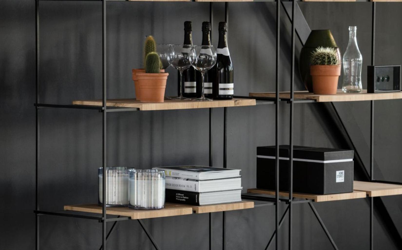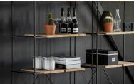 Room divider Jukebox heeft een metalen frame met meerdere eiken legplanken.
