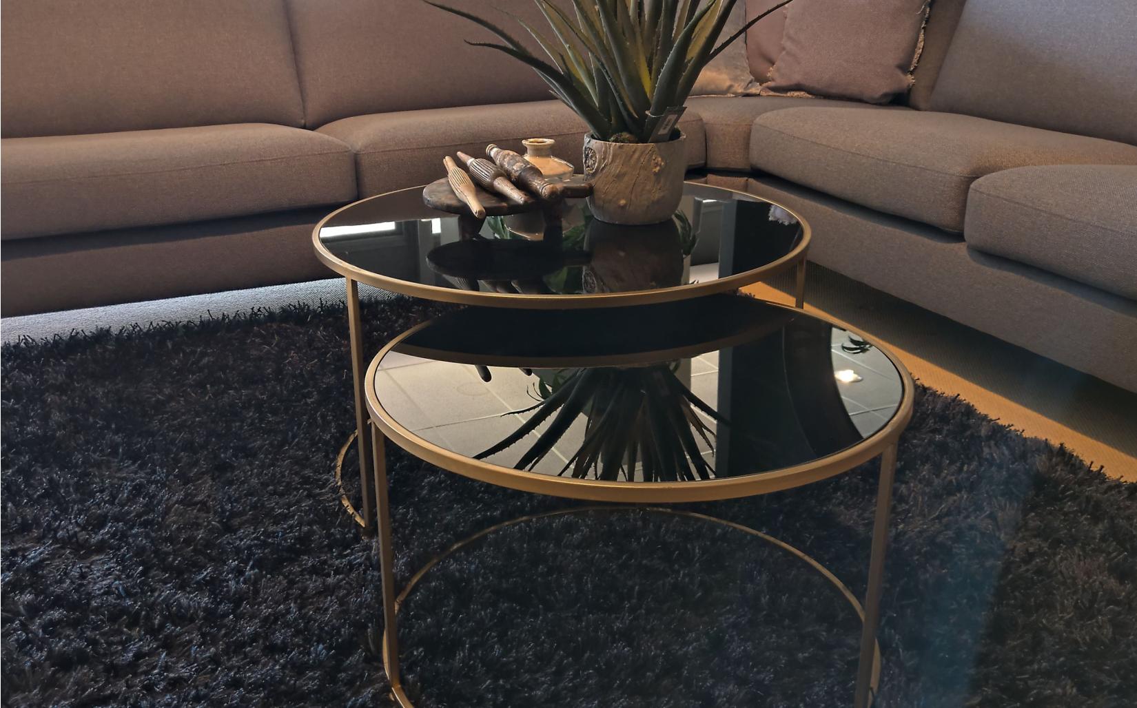 Gouden ijzeren frame met zwarte glazen plaat. Versierd met accessoires die in de winkel te vinden zijn.